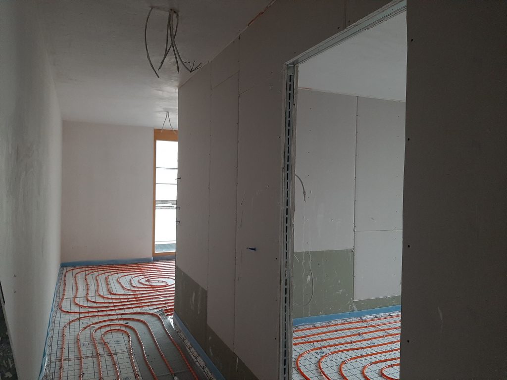 Die Baustelle ging seit dem letzten Artikel zackig voran. Die Innenwände wurden verputzt, und da dadurch viel Feuchtigkeit ins Haus kam, haben wir jetzt seit Anfang Dezember Lüft- und Wischdienst. Jeden Abend geht jemand von uns durch das ganze Haus und reißt zuerst alle Fenster auf. Dann wird die Nässe an den Scheiben und am Rahmen aufgewischt und danach gewartet, solange man es in der Kälte aushalten kann, um das maximale Lüftergebnis zu erzielen. Schließlich wird alles wieder zugemacht. Wir rennen also drei Mal durchs ganze Haus mit mehreren Stockwerken und müssen deshalb ansonsten keinen Sport mehr machen. Darüber hinaus trainieren wir unsere Kälteresilienz, denn es ist wirklich saukalt und die Wischerei macht es auch noch nass. Auch unsere Feinmotorik verbessert sich rasant, da wir um die mittlerweile labyrinthartig verlegten Schläuche der Fußbodenheizung herumbalancieren müssen oder das zumindest versuchen, während man mit der Stirnlampe auf der Rübe eigentlich nicht wirklich sieht, was Sache ist. Alles gute Gründe, warum die HEck-Pilot*innen sich um die Lüft- und Wischerei reißen. Das Argument, dass wir tausende von Euro sparen, wenn wir keinen Bautrockner brauchen, ist da eher zweitrangig.